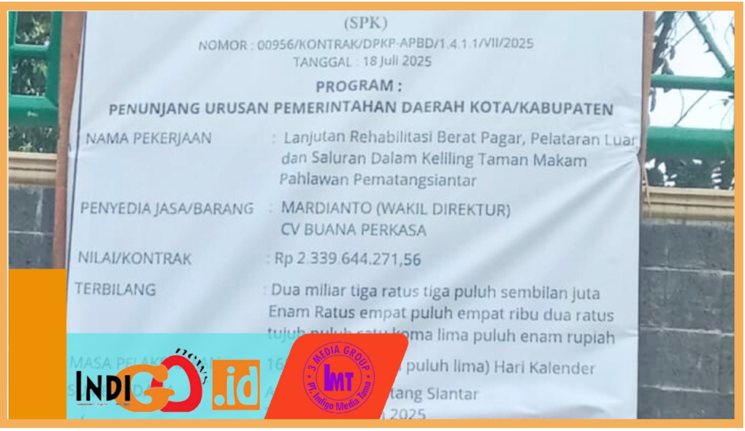 INDIGONEWS – CV. Buana Perkasa pelaksana proyek lanjutan rehabilitasi berat pagar, pelataran luar dan saluran dalam keliling Taman Makam Pahlawan (TMP) Kota Pematangsiantar dengan nomor kontrak: 00956/ KONTRAK/ DPKP-APBD/ 1.4.1.1/ VII/ 2025 dengan pagu aggaran Rp. 2.339.644.271.56 terkesan tidak paham akan regulasi penebangan pohon mahoni yang merupakan aset Pemko Pematangsiantar, Rabu (6/8/2025).