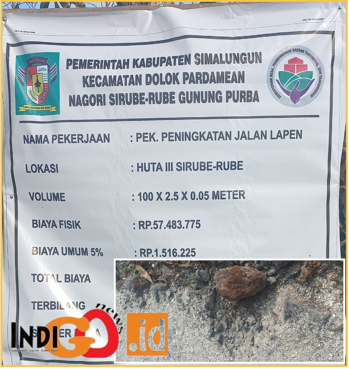 iGNews | Simalungun – Proyek peningkatan jalan Lapen Dana Desa Nagori Sirube Rube Gunung Purba, Kecamatan Dolok Pardamean, Kabupaten Simalungun – Sumatera Utara sebesar Rp. 59.000.000 dengan volume kegiatan 100 x 2.5 x 0.05 Meter di Huta III Sirube Rube terlihat asal jadi, bahkan titik trial dilakukan adanya pemindahan titik nol sekitar 20 Meter, Jumat… Lanjutkan membaca DD TA 2023, Pekerjaan Lapen Huta III Sirube Rube Disinyalir Kurangi Volume…!!!