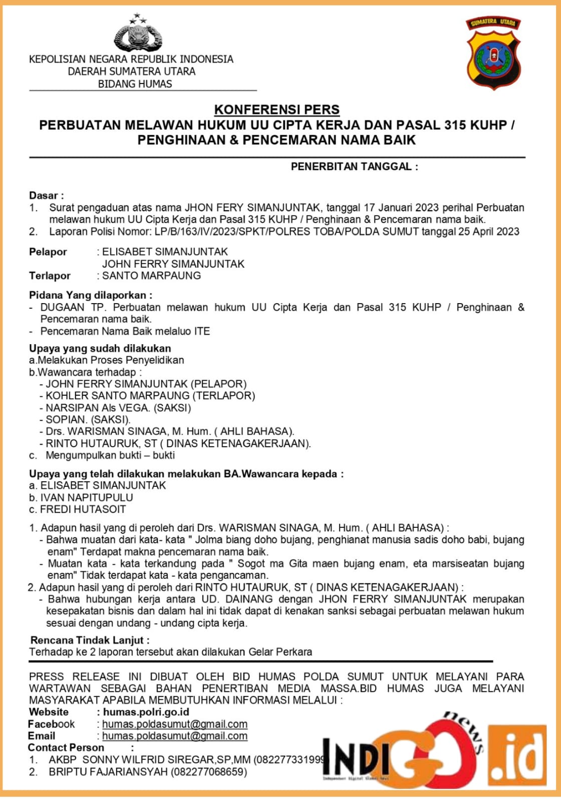 IGNews | Toba – Laporan JFS Nomor: R/ LI/ 03/ I/ 2023 atas dugaan perlawanan hukum UU Cipta Kerja dan UU ITE tentang pengiriman informasi elektronik melalui Whatsapp yang berisikan pengancaman, menakutnakuti, penghinaan dan pencemaran nama baik yang ditujukan secara pribadi terhadap JFS, dipertanyakan kembali sudah sejauh mana penanganan dari Unit Tipidter Satreskrim Polres Toba.… Lanjutkan membaca Wassidik Dirreskrimsus Polda Sumut Gelar Perkara Khusus Sudah Dilakukan, Polres Toba Akan Kembali Gelar Perkara Laporan JFS Terhadap SM Pemilik UDD